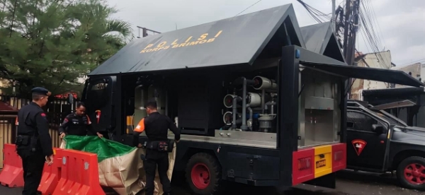Tiba dilokasi bencana, anggota menggelar peralatan dan perlengkapan water treatment untuk memberikan bantuan air bersih kepada masyarakat korban banjir.